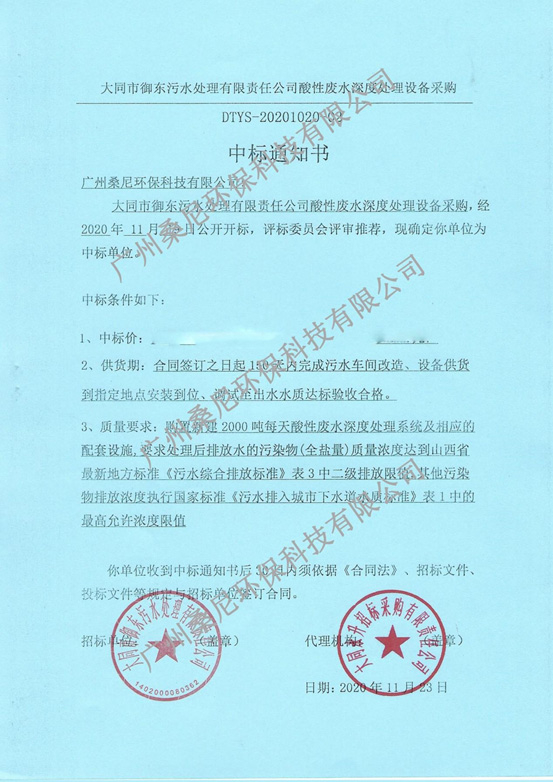 廣州桑尼環(huán)??萍加邢薰緟⑴c酸性廢水深度處理設(shè)備采購項(xiàng)目投標(biāo),以良好的信譽(yù)、豐富的經(jīng)驗(yàn)、強(qiáng)大的技術(shù)實(shí)力以及專業(yè)的方案、合理的報價贏得了招標(biāo)單位以及評標(biāo)專家的肯定,成功中標(biāo)。