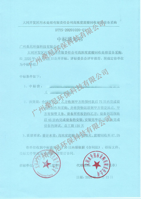 廣州桑尼環(huán)??萍加邢薰境晒χ袠?biāo)高濃度廢酸回收處理設(shè)備采購項(xiàng)目以良好的信譽(yù)、豐富的經(jīng)驗(yàn)、強(qiáng)大的技術(shù)實(shí)力以及專業(yè)的方案、合理的報價贏得了招標(biāo)單位以及評標(biāo)專家的肯定,成功中標(biāo)。